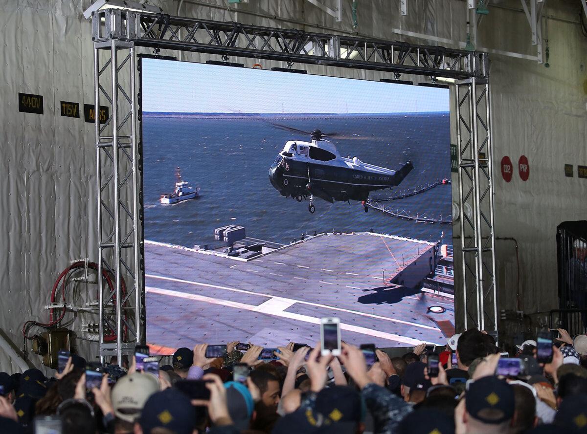 Members of the U.S. Navy and shipyard workers watch as Marine One, carrying U.S. President Donald Trump, lands on the deck of USS Gerald R. Ford CVN 78 that is being built at Newport News shipbuilding, in Newport News, Virginia, on March 2, 2017. Mark Wilson/Getty Images