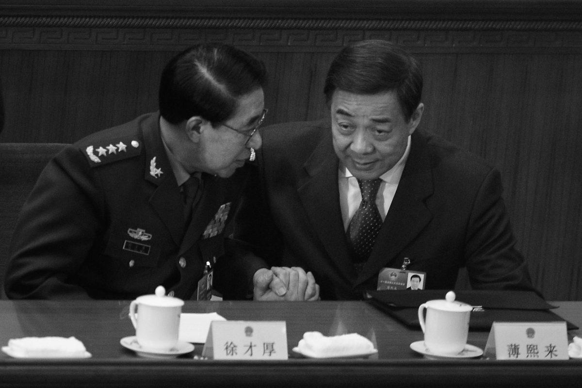The then-vice chairman of the Central Military Commission Xu Caihou (L) appears to console former Politburo member Bo Xilai after the third plenary meeting of the rubber-stamp National People's Congress in Beijing on March 9, 2012. One month later, Bo would be removed from all of his Party posts, the first prominent member of Jiang Zemin's faction to be purged. Xu was also purged. Feng Li/Getty Images