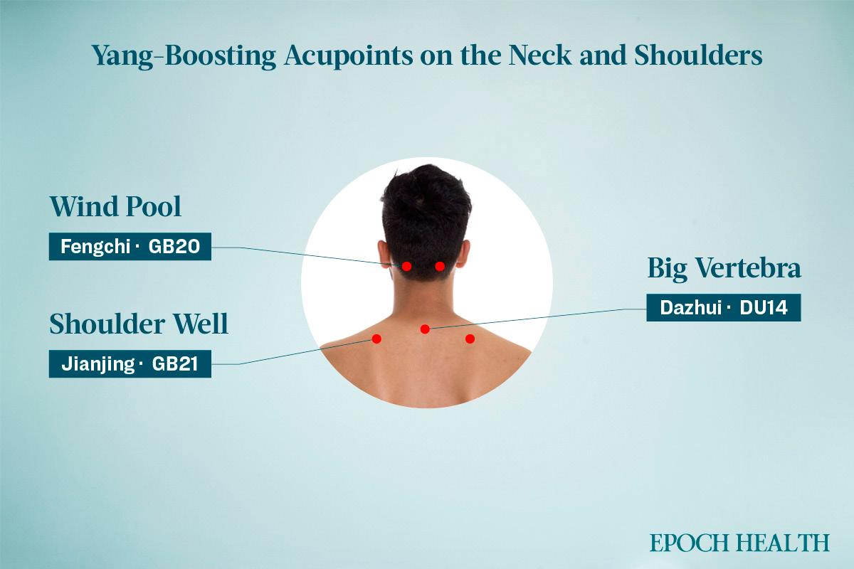 For those prone to cold heads, tightness, or headaches, warm the Fengchi (located where the two tendons meet at the back of the neck), Jianjing (the highest point of the shoulders), and Dazhui (the most prominent point at the base of the neck when the head is tilted forward) acupoints.