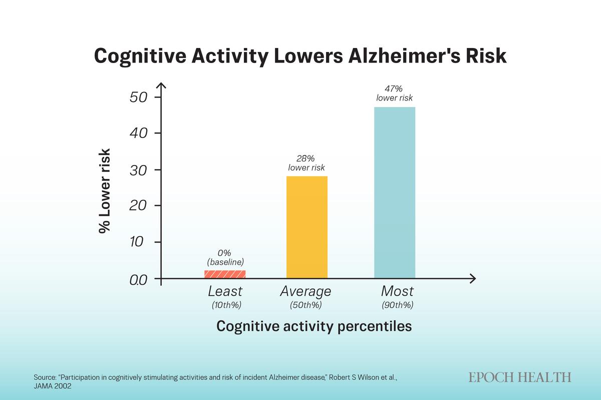 After a 4 1/2-year follow-up, the researchers found that “a 1-point increase in cognitive activity score was associated with a 33% reduction in risk of [Alzheimer’s disease].”