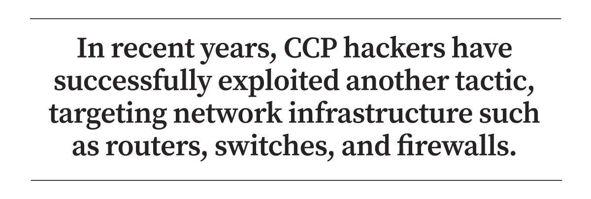 In recent years, CCP hackers have successfully exploited yet another tactic, targeting network infrastructure such as routers, switches, and firewalls. Security flaws in the firmware of such devices are routinely patched by their producers, but end users don’t necessarily keep them up to date.