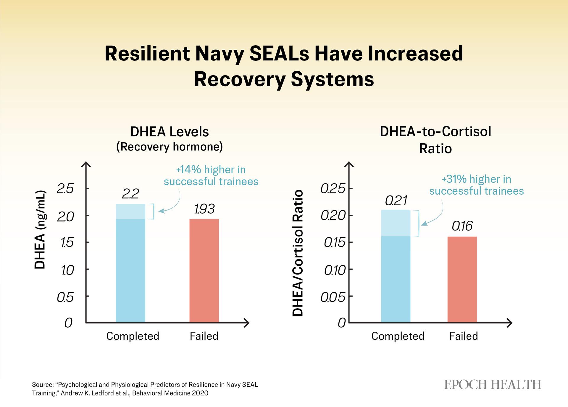 Those who passed the training had significantly higher levels of DHEA, a hormone that helps restore balance after stress. These resilient individuals had a DHEA-to-cortisol ratio 32 percent higher than those who did not complete the task. Akin to driving, cortisol serves as your gas pedal, and DHEA as your brakes. Successful Navy SEALs had both the hormonal engine to deal with the stressors and brakes to reset to baseline.